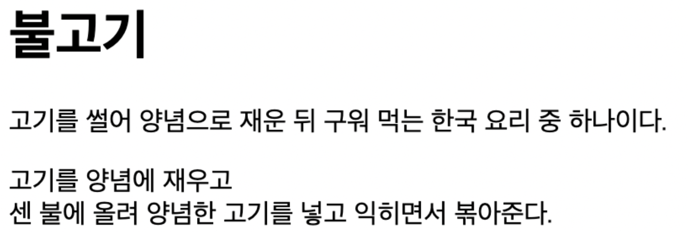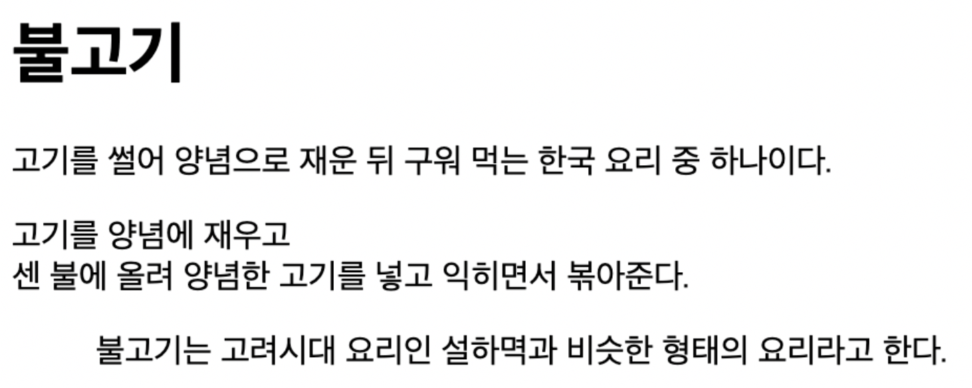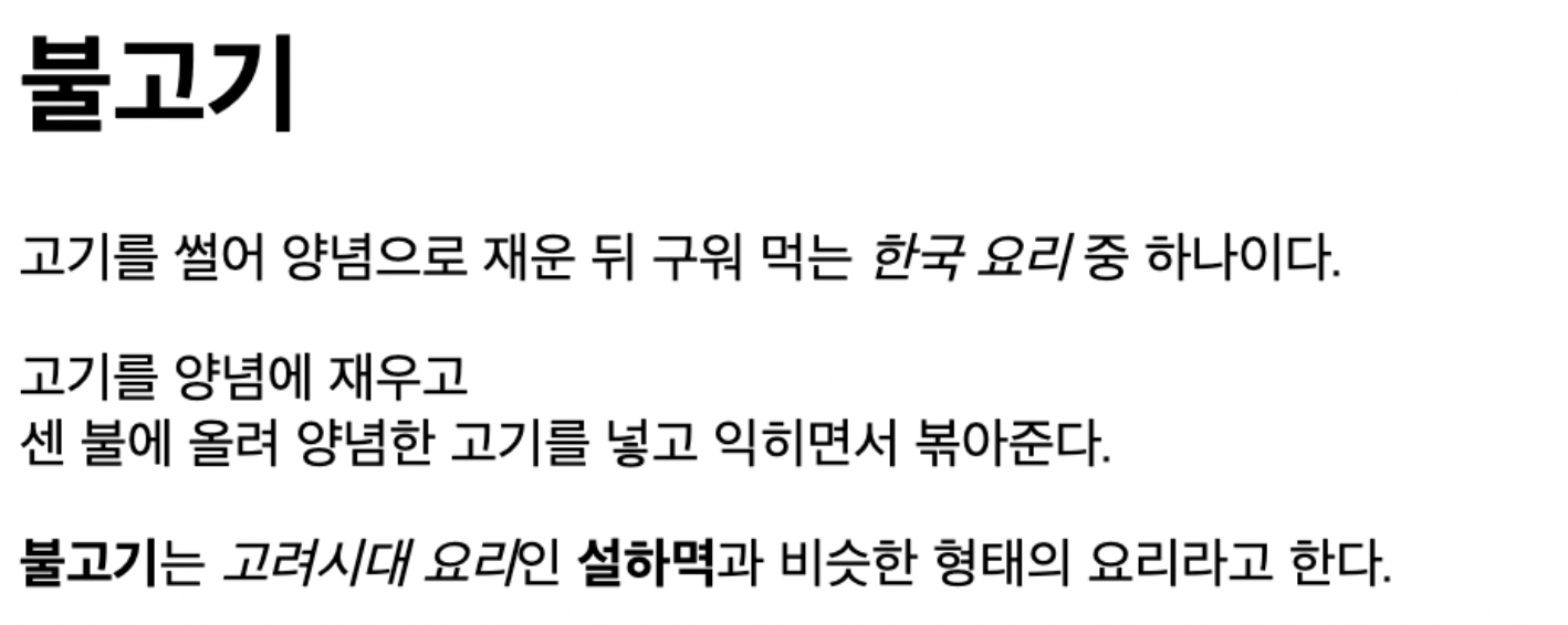 <p><b>불고기</b>는 <em>고려시대 요리</em>인 <strong>설하멱</strong>과 비슷한 형태의 요리라고 한다.</p>